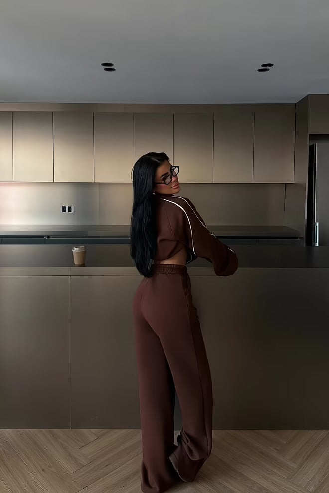 The Cloud Zip Lounge Set in rich chocolate brown brings an elevated twist to everyday comfort. Crafted from ultra-soft, heavyweight fabric, it features a relaxed quarter-zip sweatshirt and wide-leg joggers with contrast piping for a clean, modern edge.