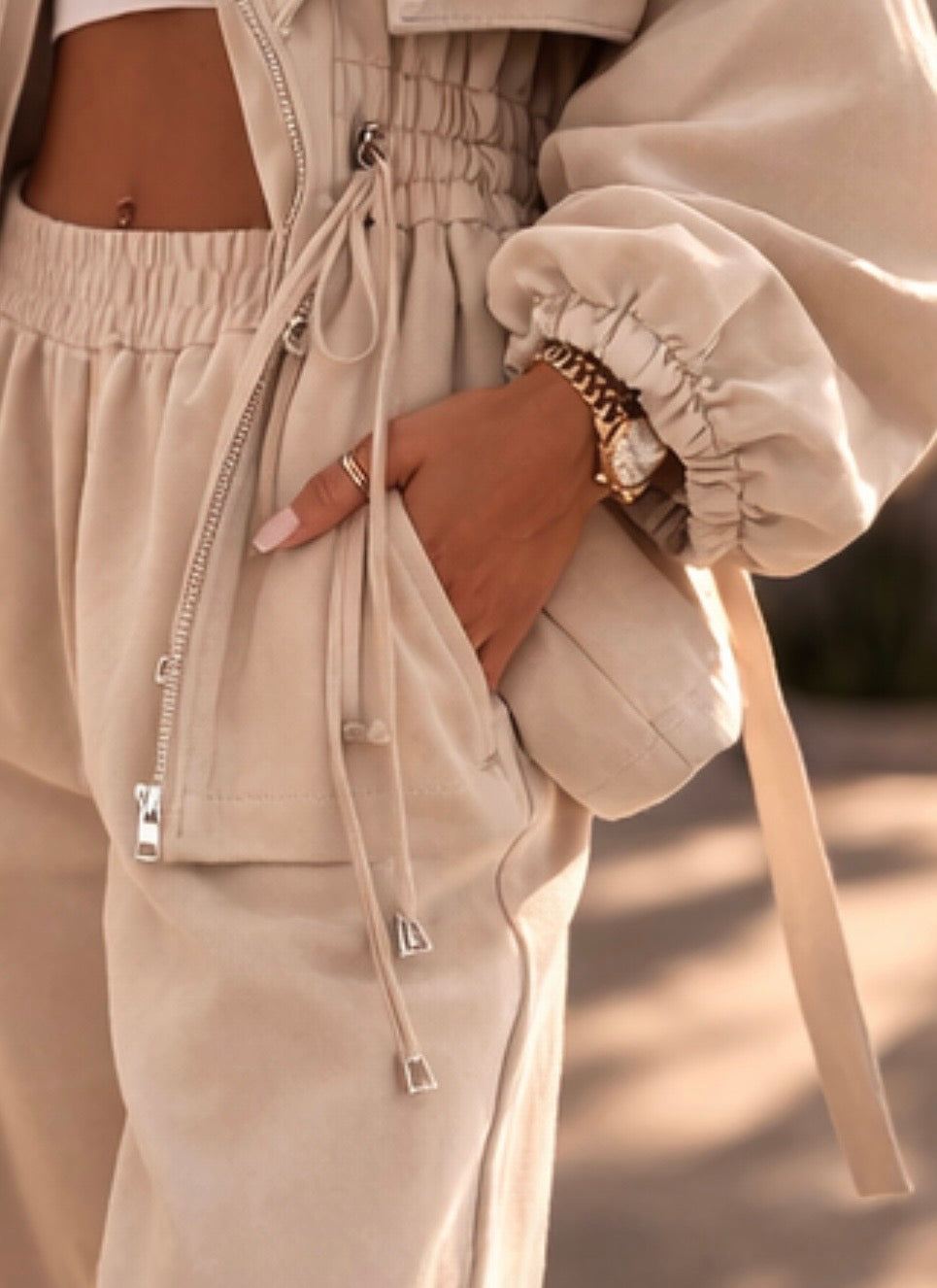 Designed with a relaxed wide-leg trouser and a statement zip jacket featuring adjustable waist detailing and soft structured shoulders, this set is the perfect throw-on outfit that still looks put together.